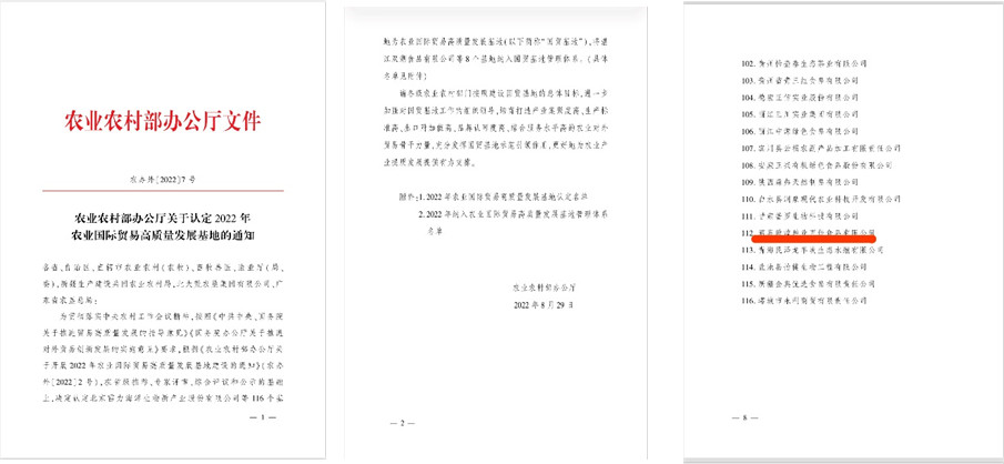 酒泉敦煌種業(yè)百佳食品有限公司被農業(yè)農村部認定為2022年農業(yè)國際貿易高質量發(fā)展基地